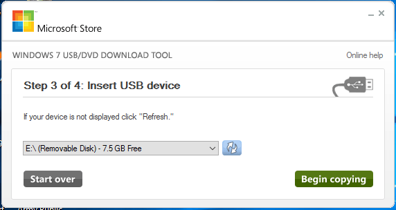 USB device will be detected automatically. A refresh button is provided if the pendrive is not visible. If multiple USB devices are present in the system, use the drop down arrow to choose. Once ready, click on the button Begin Copying.