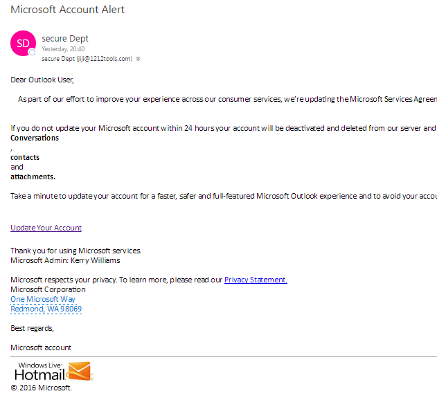 The from address is a straight give away. Also the Microsoft Admin who send the email, Kerry Williams is actually an actress.
